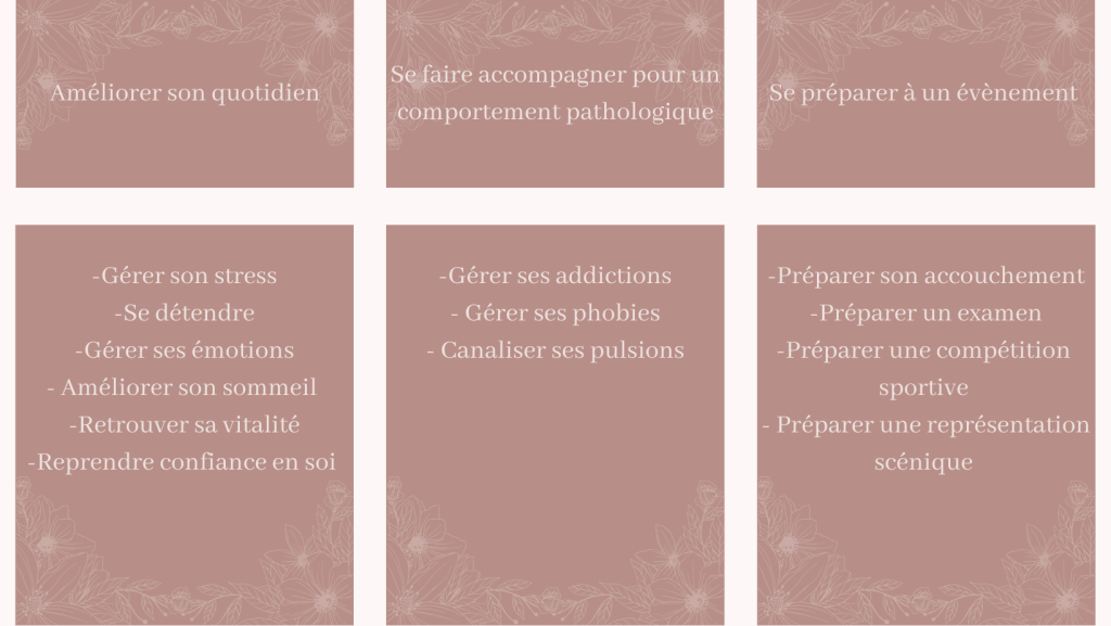 La sophrologie a pour objectif de dépasser les blocages psychiques ou physiques, afin de développer les capacités présentes en chacun. Elle peut être utilisée comme une technique de développement personnel, ou dans un but thérapeutique. Voici les principales demandes d’accompagnement.